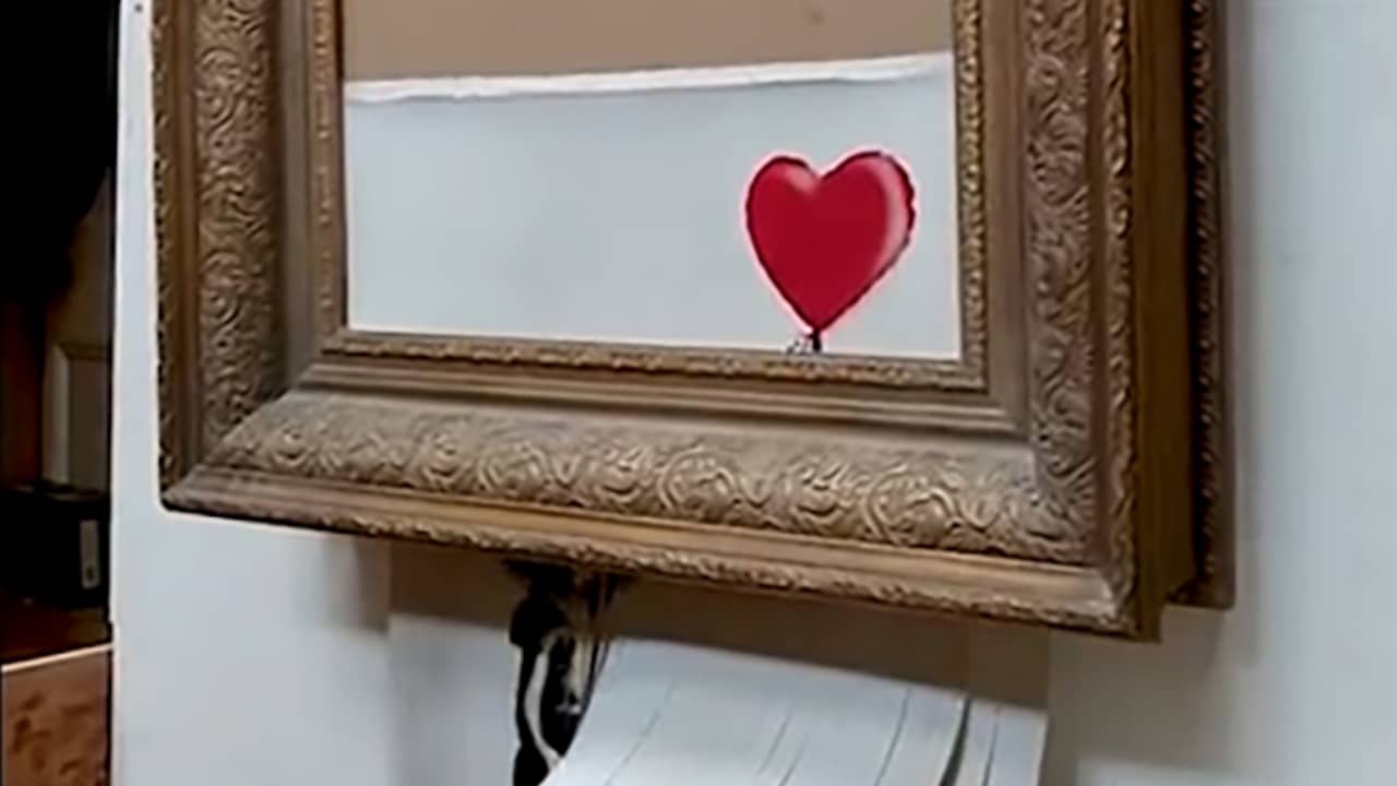 Bei einer auktion in london zerstörte sich ein kunstwerk des berühmten künstlers banksy selbst.
